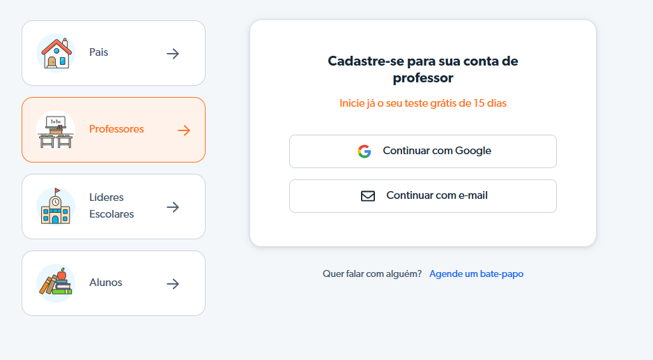 - Selecione Professores. Você pode continuar com o Google ou e-mail.
