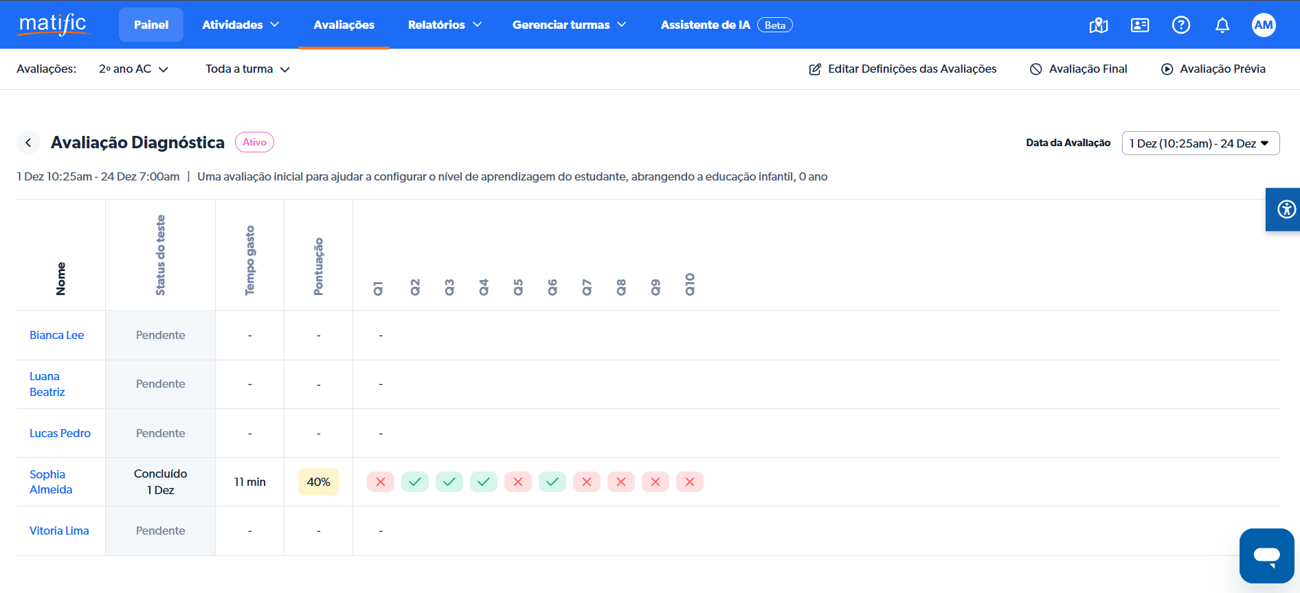 Na página de Avaliações, expanda uma avaliação ativa para ver o progresso da turma de forma rápida.