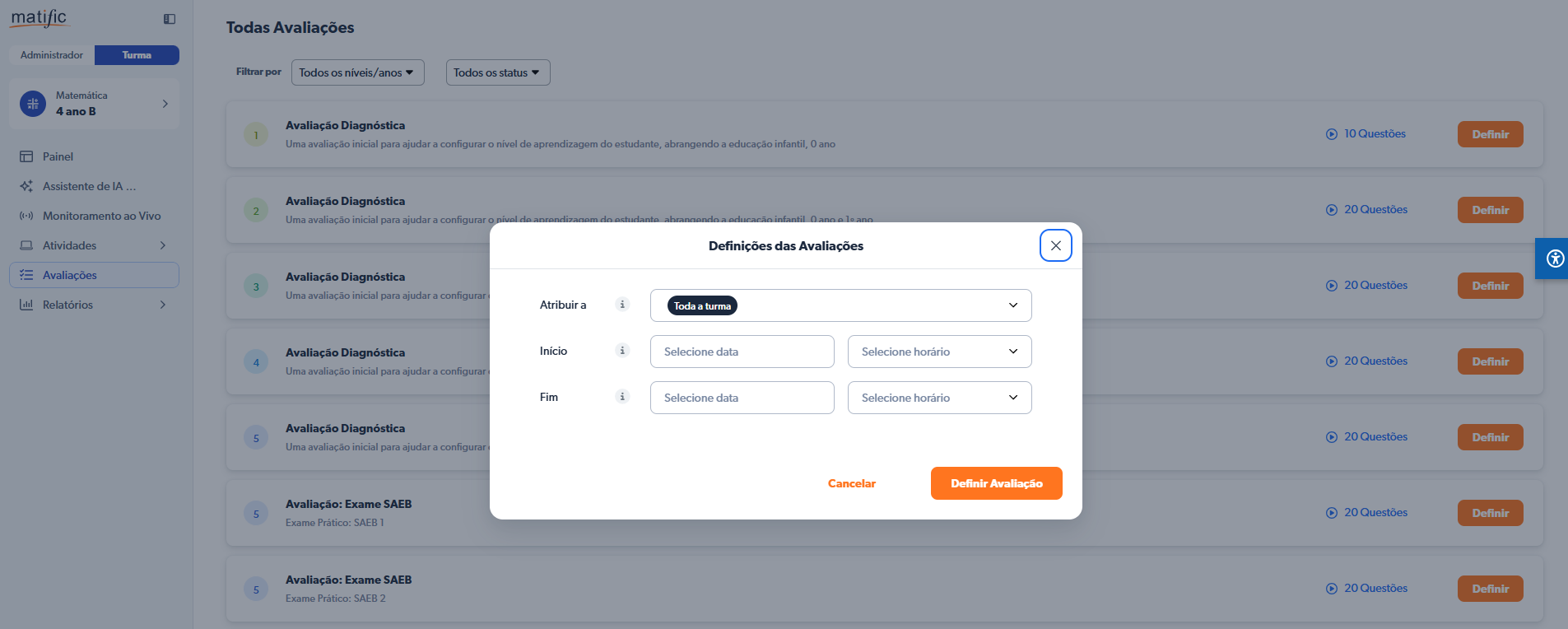 Na página de Avaliações, localizada no menu lateral, clique em Definir para atribuir a avaliação.